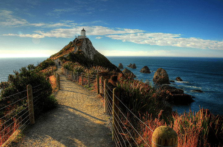 如果你想拍摄迷人的野外景色,那么一定不要错过努盖特角。是奥塔哥(Otago) 海岸上最独特的地貌之一,一座陡峭的山岬,矗立着一个灯塔,并散布着众多犹如金块的岩石小岛。
